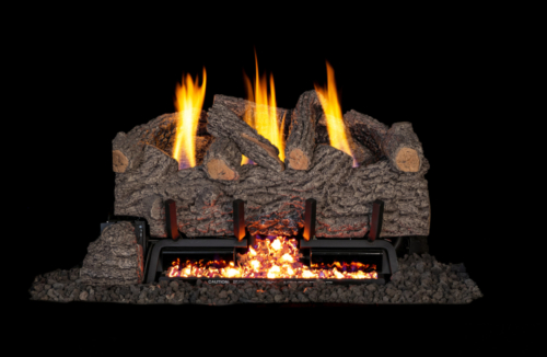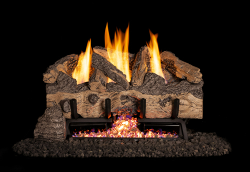 Vent-free gas log set by Real Fyre with G10 burner system available in Charred Aged Split Oak, Charred Frontier Oak, Charred Alpine Birch, Charred Gnarled Split, and Gnarled Oak styles.
